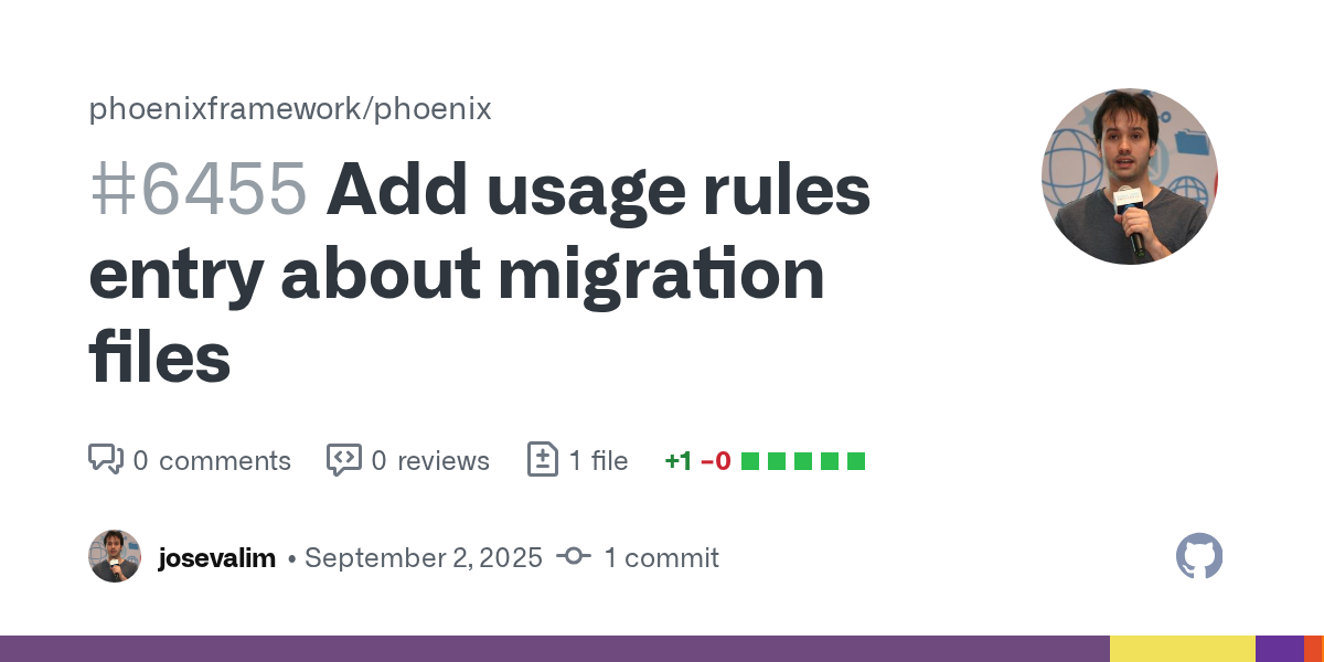 josevalim merged phoenixframework/phoenix#6455 · September 1, 2025 22:55 Add usage rules entry about migration files #6455 +1 -0