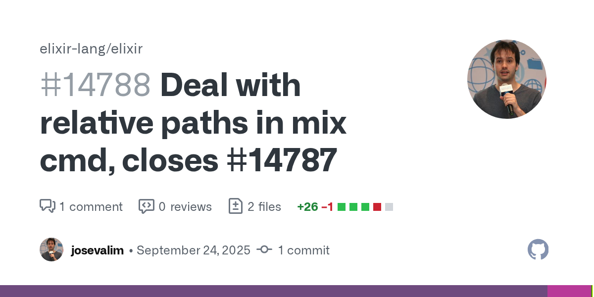 josevalim merged elixir-lang/elixir#14788 · September 24, 2025 05:17 Deal with relative paths in mix cmd, closes #14787 #14788 +2