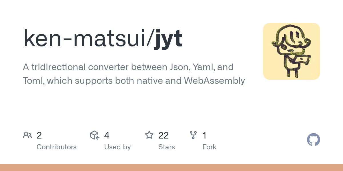 GitHub - ken-matsui/jyt: A tridirectional converter between Json, Yaml, and Toml, which supports both native and WebAssembly