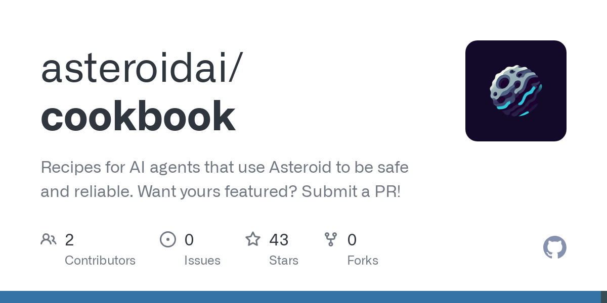 GitHub - asteroidai/cookbook: Recipes for AI agents that use Asteroid to be safe and reliable. Want yours featured? Submit a PR!