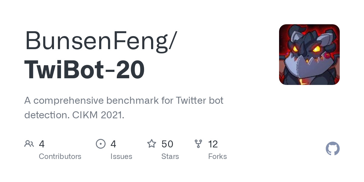 GitHub - BunsenFeng/TwiBot-20: A comprehensive benchmark for Twitter bot detection. CIKM 2021.