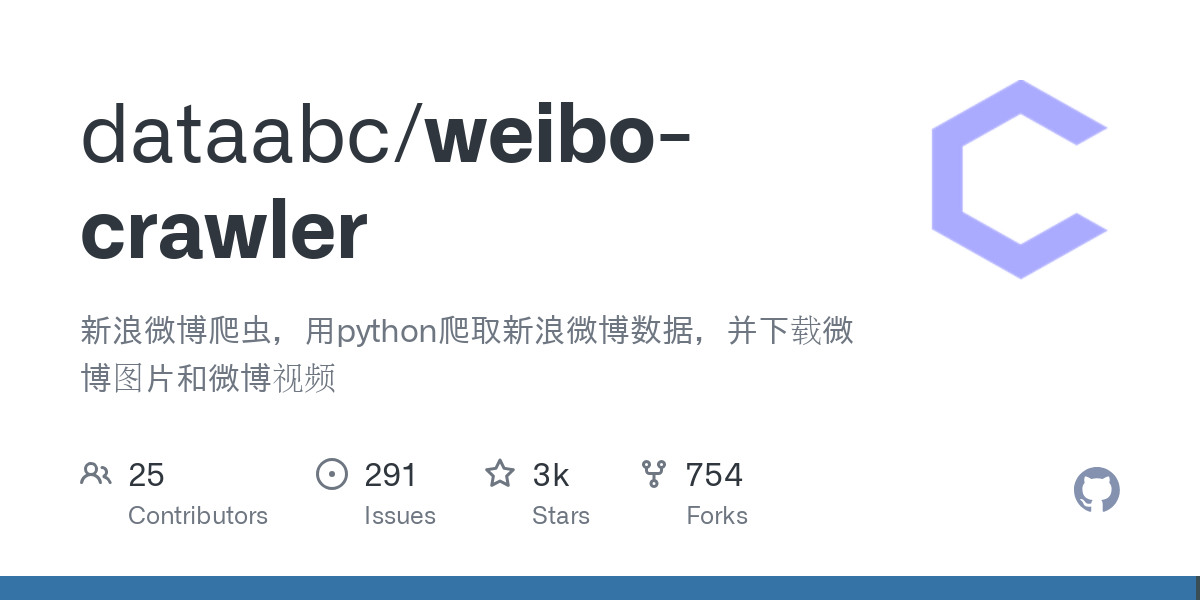 GitHub - dataabc/weibo-crawler: 新浪微博爬虫,用python爬取新浪微博数据,并下载微博图片和微博视频