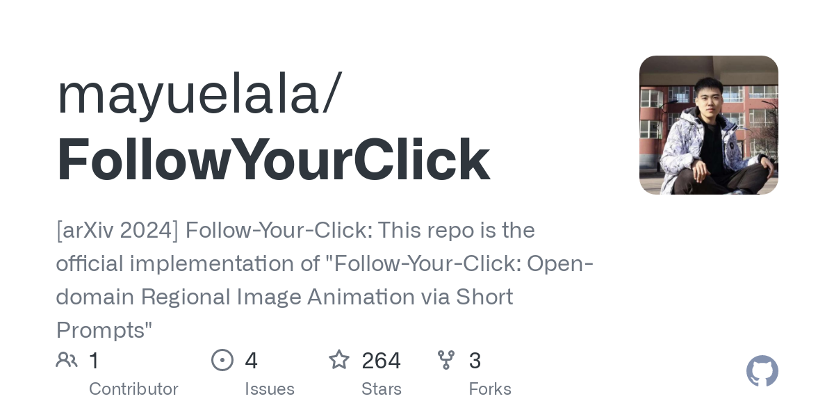 GitHub - mayuelala/FollowYourClick: [arXiv 2024] Follow-Your-Click: This repo is the official implementation of "Follow-Your-Click: Open-domain Regional Image Animation via Short Prompts"