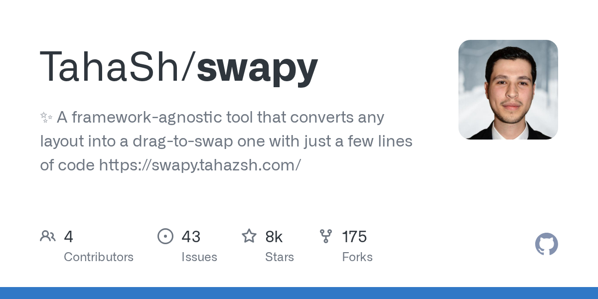 GitHub - TahaSh/swapy: ✨ A framework-agnostic tool that converts any layout into a drag-to-swap one with just a few lines of code https://swapy.tahazsh.com/