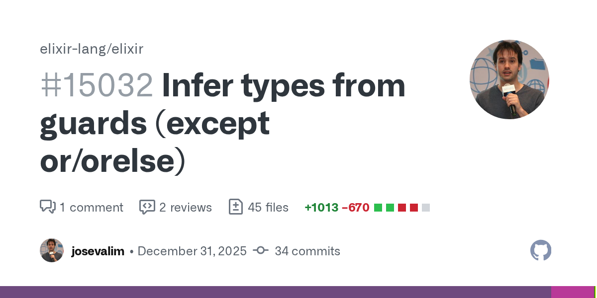 josevalim merged elixir-lang/elixir#15032 · January 2, 2026 10:48 Infer types from guards (except or/orelse) #15032 +1,013 -670