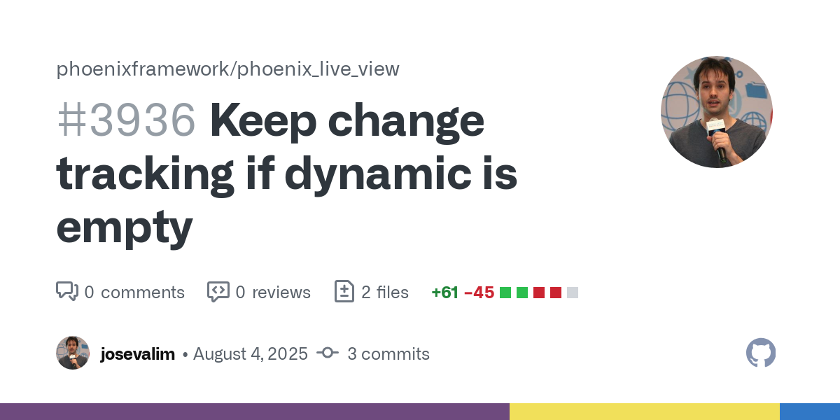 josevalim merged phoenixframework/phoenix_live_view#3936 · August 5, 2025 02:57 Keep change tracking if dynamic is empty #3936 +6