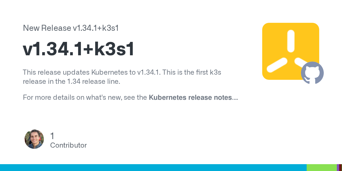 This release updates Kubernetes to v1.34.1. This is the first k3s release in the 1.34 release line. For more details on what's new, see the Kubernetes release notes. Changes since v1.33.4+k3s1: Bu...