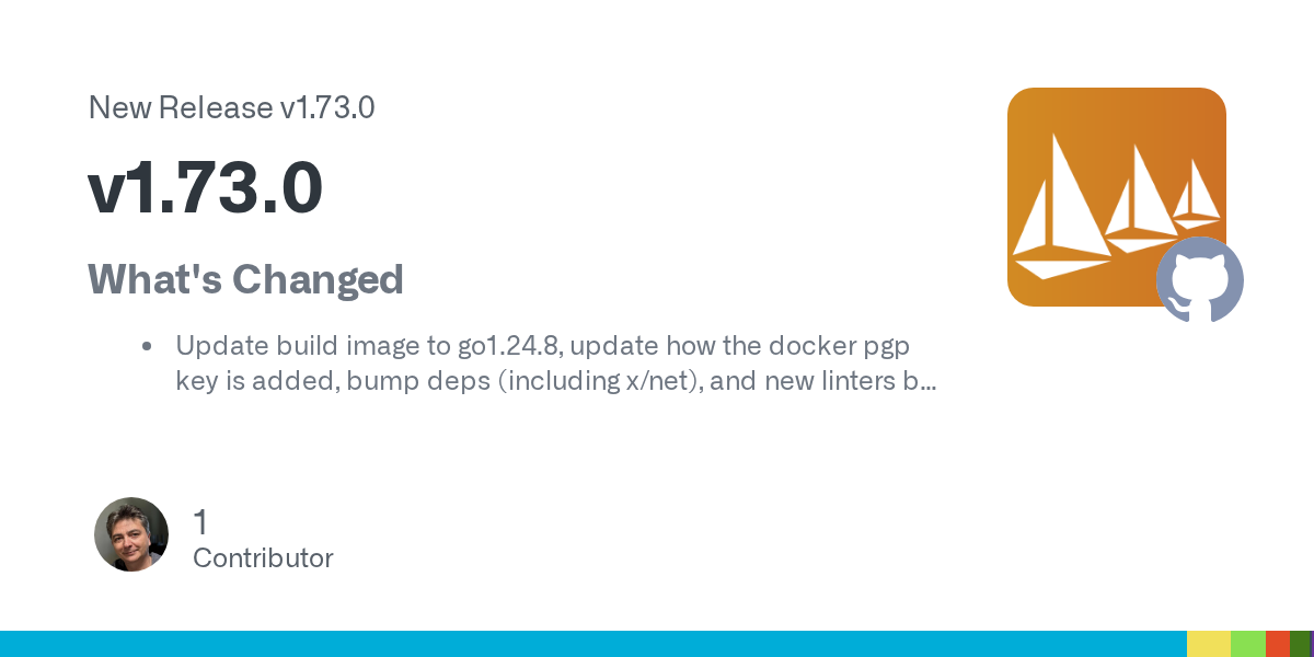 What's Changed Update build image to go1.24.8, update how the docker pgp key is added, bump deps (including x/net), and new linters by @ldemailly in #1097 Full Changelog: v1.72.0...v1.73.0
