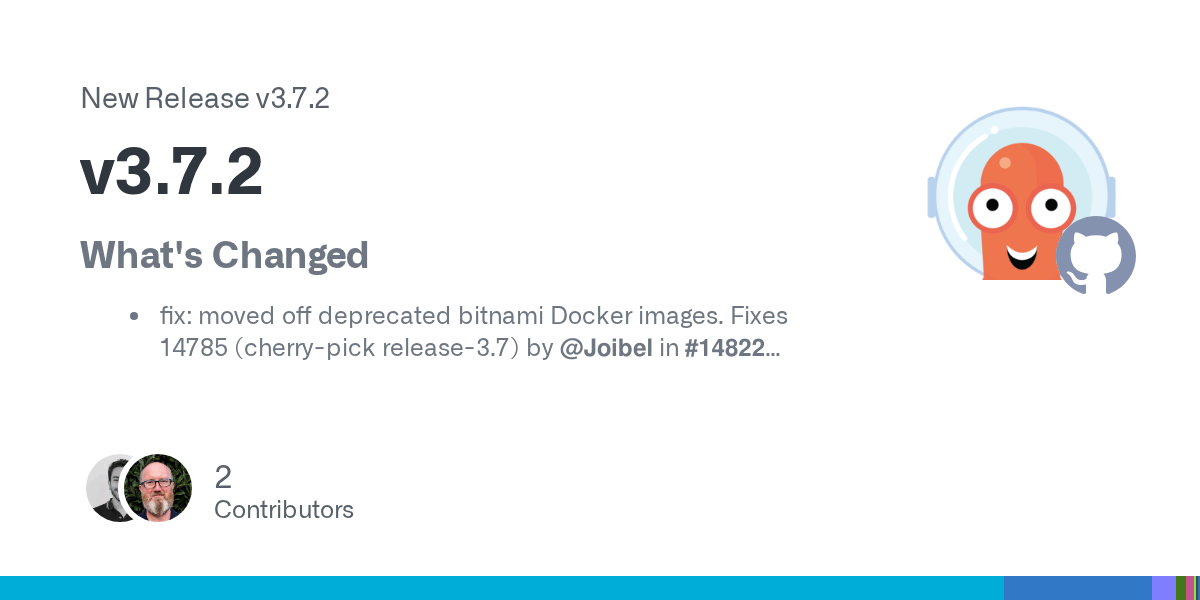 What's Changed fix: moved off deprecated bitnami Docker images. Fixes 14785 (cherry-pick release-3.7) by @Joibel in #14822 fix: Add default value for creationtimestamp column addition. Fixes #… (c...