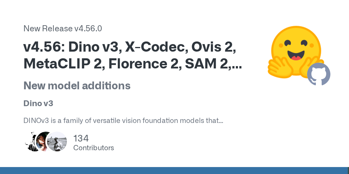 Release v4.56: Dino v3, X-Codec, Ovis 2, MetaCLIP 2, Florence 2, SAM 2, Kosmos 2.5, HunYuan, GLMV-4.5 · huggingface/transformers