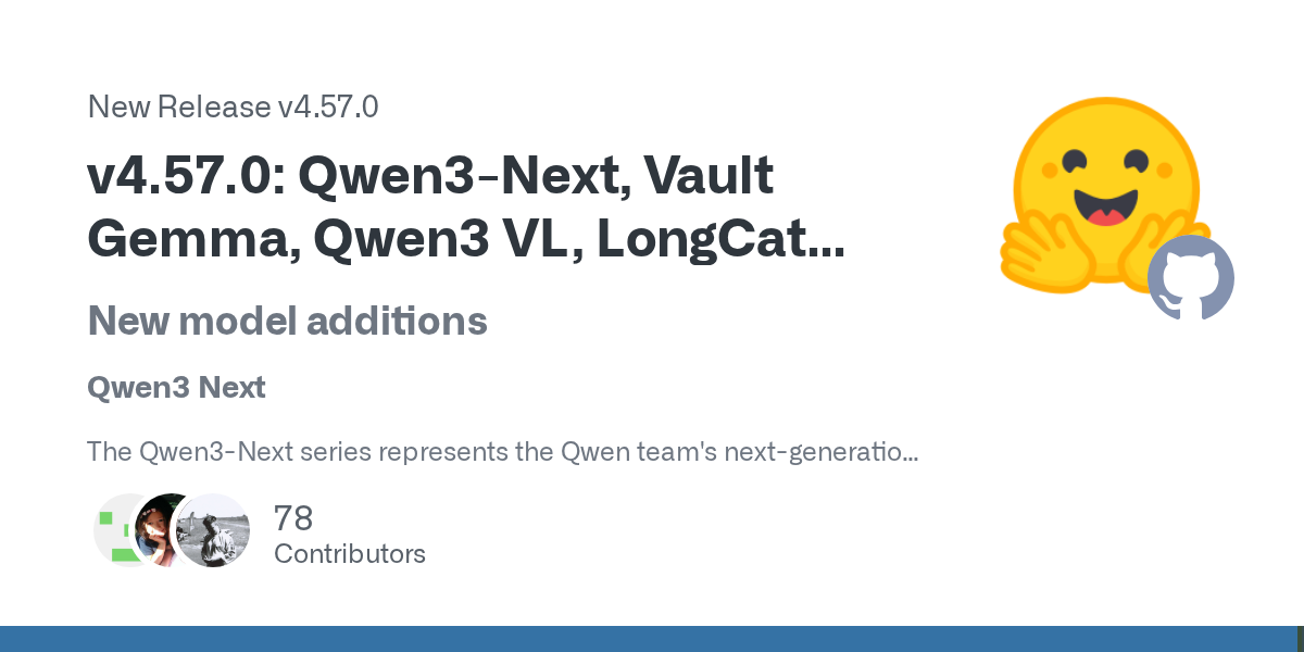 Release v4.57.0: Qwen3-Next, Vault Gemma, Qwen3 VL, LongCat Flash, Flex OLMO, LFM2 VL, BLT, Qwen3 OMNI MoE, Parakeet, EdgeTAM, OLMO3 · huggingface/transformers