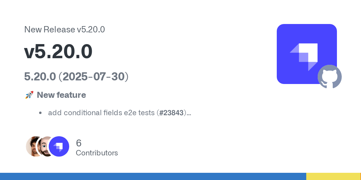5.20.0 (2025-07-30) ๐ New feature add conditional fields e2e tests (#23843) ๐ฅ Bug fix document_id must appear in the GROUP BY clause (947c3a83d8) resolved filter overlapping issue by changing z-...
