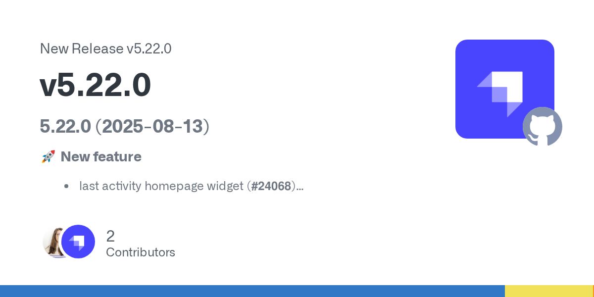 5.22.0 (2025-08-13) ๐ New feature last activity homepage widget (#24068) ๐ฅ Bug fix homepage widgets adjustments (#24071) reordering newly created components in dz cause error on save (#24114) gu...