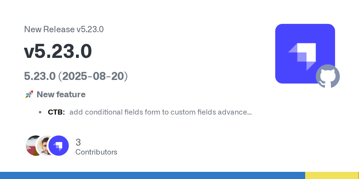 5.23.0 (2025-08-20) ๐ New feature CTB: add conditional fields form to custom fields advanced settings (#24175) ๐ฅ Bug fix wrong count for published entries in homepage widget (#24152) update trac...