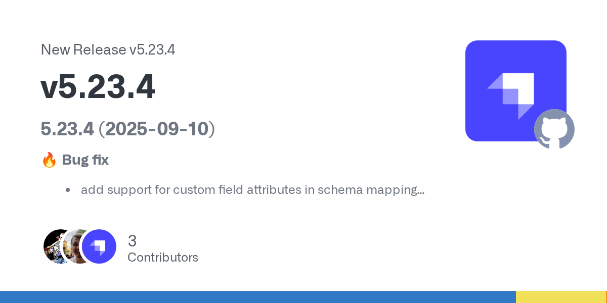 5.23.4 (2025-09-10) 🔥 Bug fix add support for custom field attributes in schema mapping (#24310) errors when trying to link design-system locally (#24247) saving deletion of optional components no...