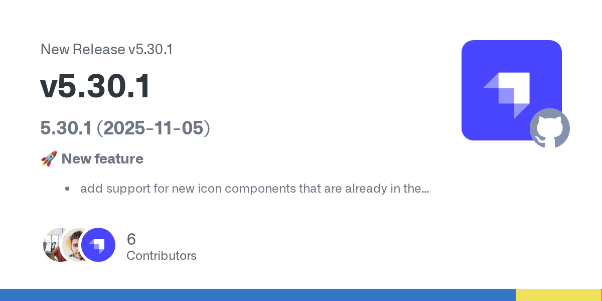 5.30.1 (2025-11-05) 🚀 New feature add support for new icon components that are already in the design system (8c44e3ecce) 🔥 Bug fix rerendering and flickering issue on i18n fields (#24605) nps su...