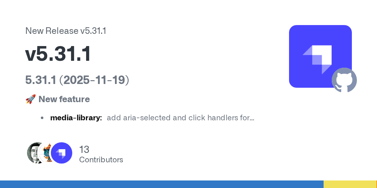 5.31.1 (2025-11-19) š New feature media-library: add aria-selected and click handlers for better ⦠(#23475) š„ Bug fix accessible responsive left menu (8f6b0444b7) bulk unpublish when creating a ...
