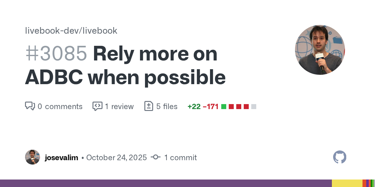 josevalim merged livebook-dev/livebook#3085 · October 28, 2025 22:31 Rely more on ADBC when possible #3085 +22 -171