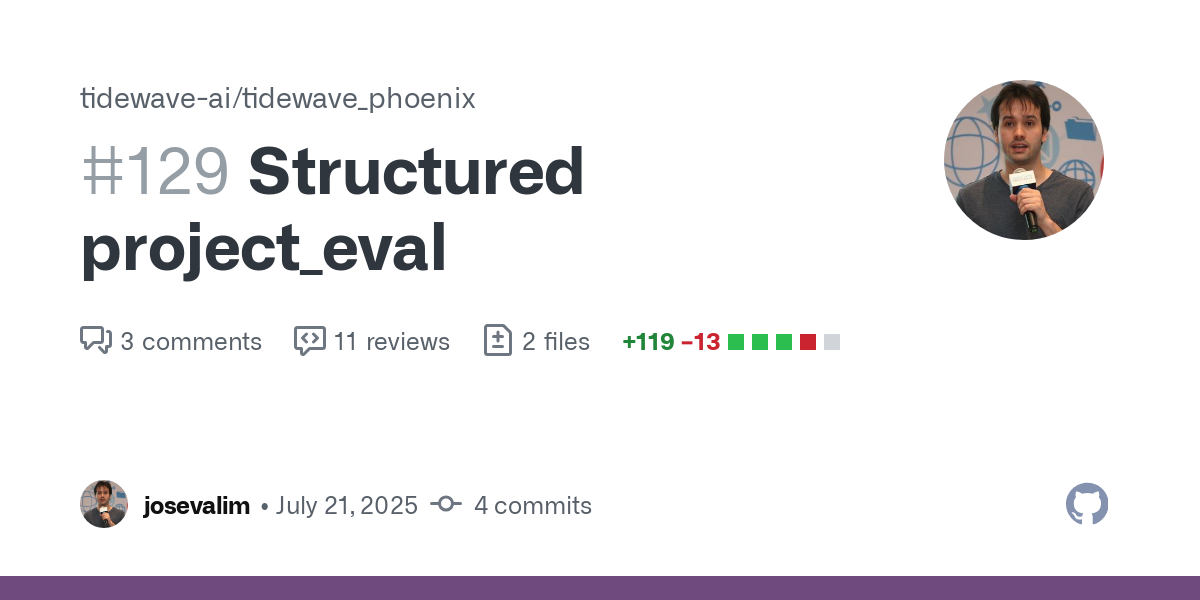 josevalim merged tidewave-ai/tidewave_phoenix#129 · July 28, 2025 08:30 Structured project_eval #129 +119 -13 14 comments