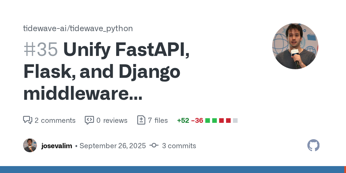 josevalim merged tidewave-ai/tidewave_python#35 · September 26, 2025 03:40 Unify FastAPI, Flask, and Django middleware configurati