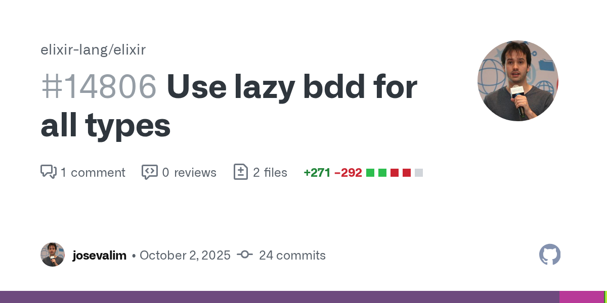 josevalim merged elixir-lang/elixir#14806 · October 2, 2025 10:30 Use lazy bdd for all types #14806 +271 -292 1 comment