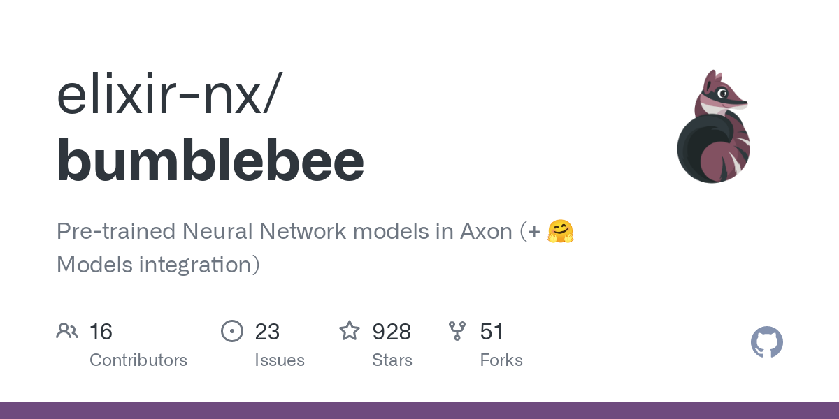 Pre-trained Neural Network models in Axon (+ 🤗 Models integration) - GitHub - elixir-nx/bumblebee: Pre-trained Neural Network models in Axon (+ 🤗 Models integration)