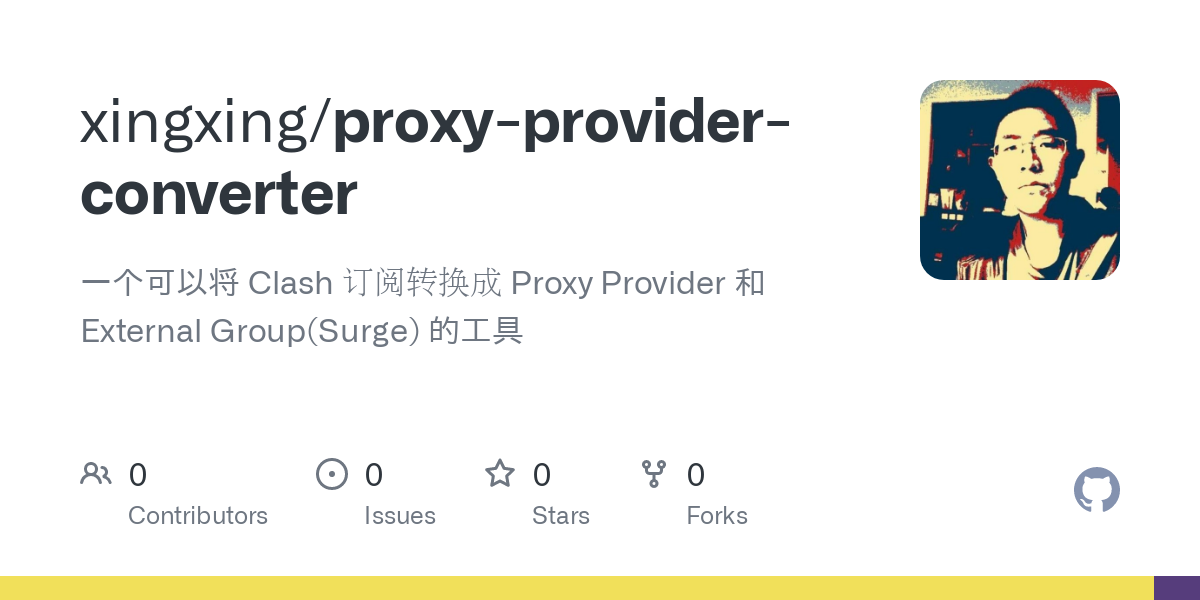 一个可以将 Clash 订阅转换成 Proxy Provider 和 External Group(Surge) 的工具 - GitHub - xingxing/proxy-provider-converter: 一个可以将 Clash 订阅转换成 Proxy Provider 和 External Group(Surge) 的工具